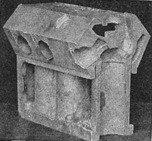 The cylinders are cast four in each block, with integral heads. Crankcase and oil pan are of aluminum, the latter being externally ribbed for strength and to provide additional radiating surface for cooling the oil.