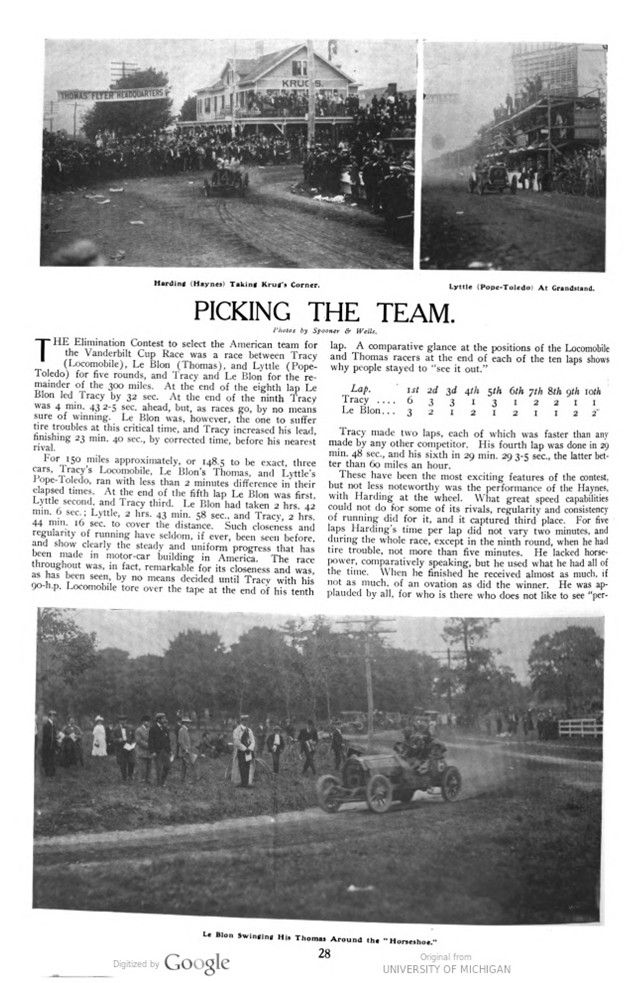 THE Elimination Contest to select the American team for the Vanderbilt Cup Race was a race between Tracy (Locomobile), Le Blon (Thomas), and Lyttle (Pope-Toledo) for five rounds, and Tracy and Le Blon for the remainder of the 300 miles. At the end of the eighth lap Le Blon led Tracy by 32 sec. At the end of the ninth Tracy was 4 min. 43 2-5 sec. ahead, but, as races go, by no means sure of winning. Le Blon was, however, the one to suffer tire troubles at this critical time, and Tracy increased his lead, finishing 23 min. 40 sec., by corrected time, before his nearest rival.