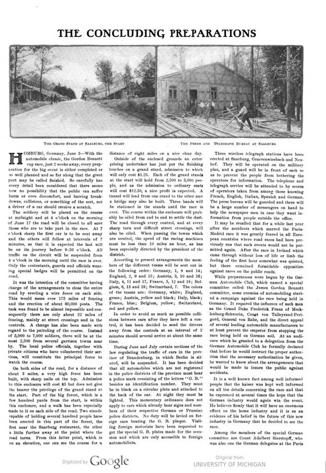 HOMBURG, Germany, June 3-With the automobile classic, the Gordon Bennett cup race, just 2 weeks away, every preparation for the big event is either completed or so well planned and so far along that the great part may be called finished. So carefully has every detail been considered that there seems now no possibility that the public can suffer harm or even discomfort, and barring breakdowns, collisions, or something of the sort, not a driver of a car should receive a scratch.