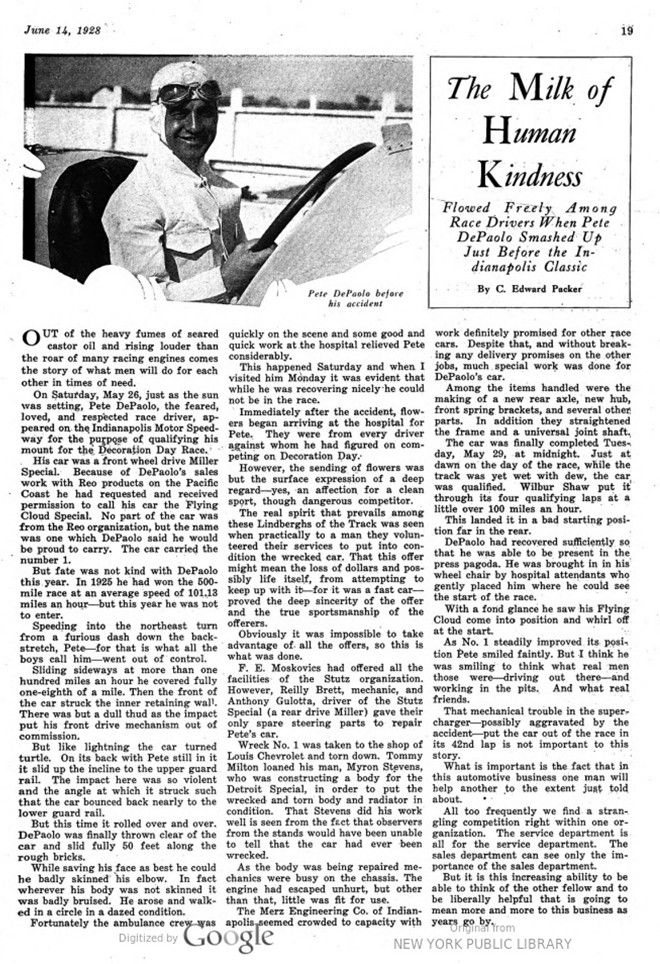 During qualifying for Sunday’s 500 miles, Pete DePaolo crahed heavily, sending him directly to the hospital. This aarticle describes how courtuous his other competitors were as „these Lindberghs of the Track“, as they are called here, supported him in more than one way. And that in a firece competition. Could this be transferred to today?