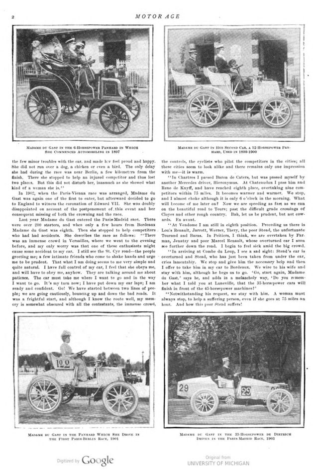Before long the 6-horsepower car had become of little interest to the woman driver, and from then on, she bought faster going cars almost every year. Being familiar with the roads and possessed of the nervous and quick temperament of the French race. Madame du Gast became greatly interested in road races and decided to enter some of these events. „When the Paris-Berlin race was organized in 1901, she was among the first to enter, and while there was some astonishment at the fact that a woman had entered a race which everybody knew would be a hard one, there was no discrimination on account of her sex.