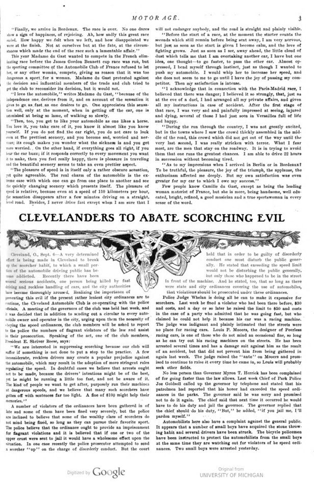 This year Madame du Gast wanted to compete in the French eliminating race before the James Gordon Bennett cup race was run, but the sporting committee Of the Automobile Club of France refused to let her, or any other woman, compete, giving as reason that it was too dangerous a sport for a woman. Madame du Gast protested against the decision and influential members of the trade and club tried to get the club to reconsider its decision, but it would not.