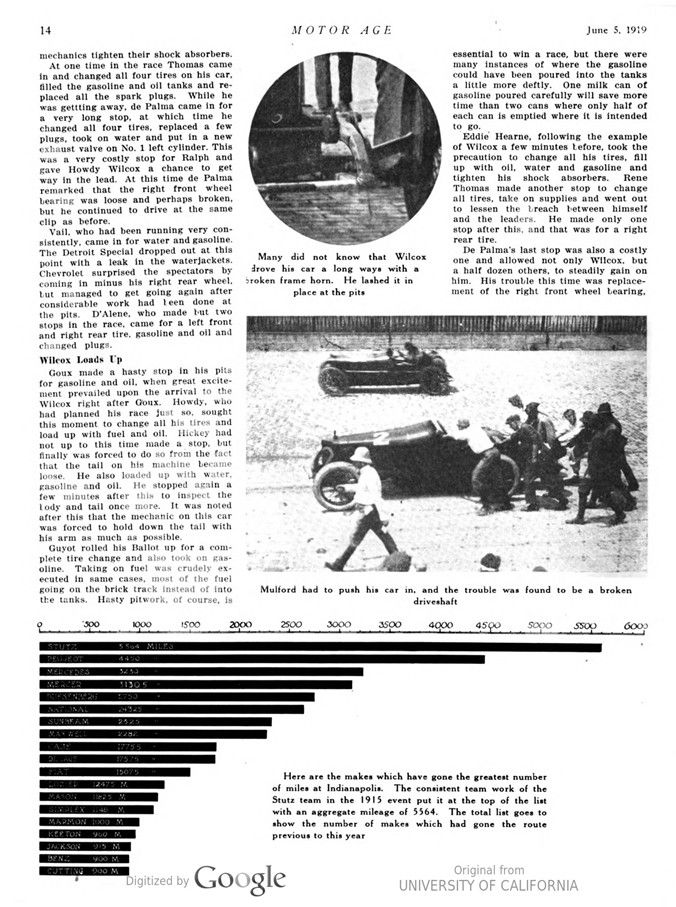 Here are the makes which have gone the greatest number of miles at Indianapolis. The consistent teamwork of the Stutz team in the 1915 event put it at the top of the list with an aggregate mileage of 5564. The total list goes to show the number of makes which had gone the route previous to this year