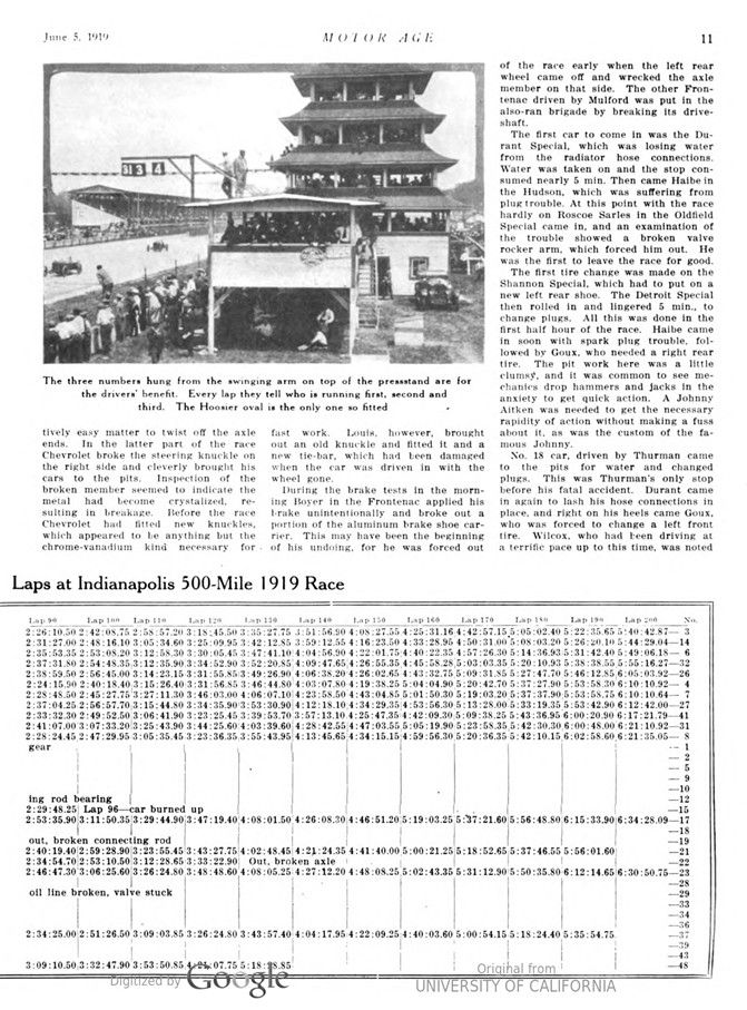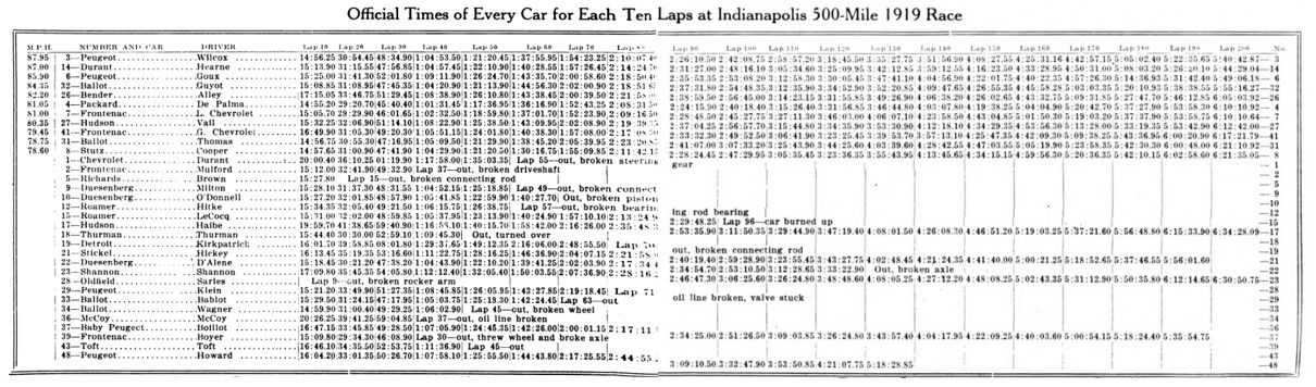 Official Times of Every Car for Each Ten Laps at Indianapolis 500-Mile 1919 Race