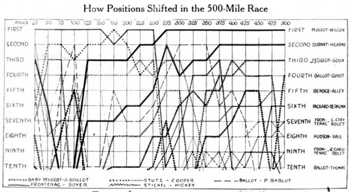 STUTZ 5564 MILES – PEUGEOT 4450 – MERCEDES 3230 – MERCER 31305 – DUESENBERG 2750 – NATIONAL 24325 – SUNBEAM 2325 – MAXWELL 2282 – CASE 1775.5 – DELAGE 17575 – FIAT 15075 – LOZIER 12475 – MASON 11825 – SIMPLEX 1148 – MARMON 1000 – KEETON 960 – JACKSON 915 – BENZ 900 – CUTTING 900