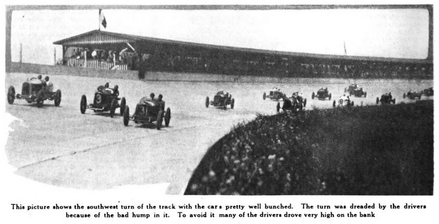 This picture shows the southwest turn of the track with the cars pretty well bunched. The turn was dreaded by the drivers because of the bad hump in it. To avoid it many of the drivers drove very high on the bank