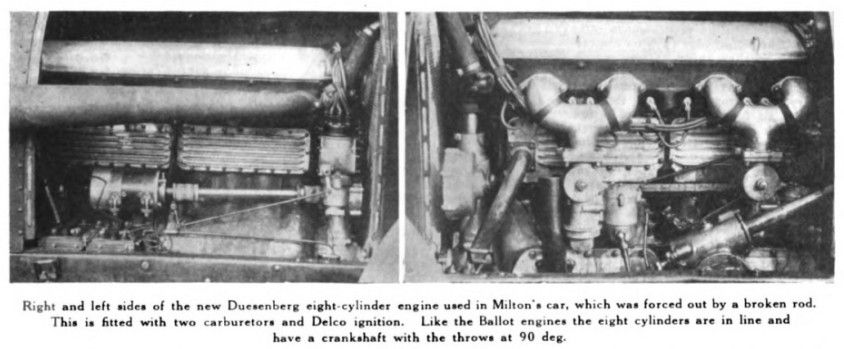 Right and left sides of the new Duesenberg eight-cylinder engine used in Milton’s car, which was forced out by a broken rod. This is fitted with two carburetors and Delco ignition. Like the Ballot engines the eight cylinders are in line and have a crankshaft with the throws at 90 deg.
