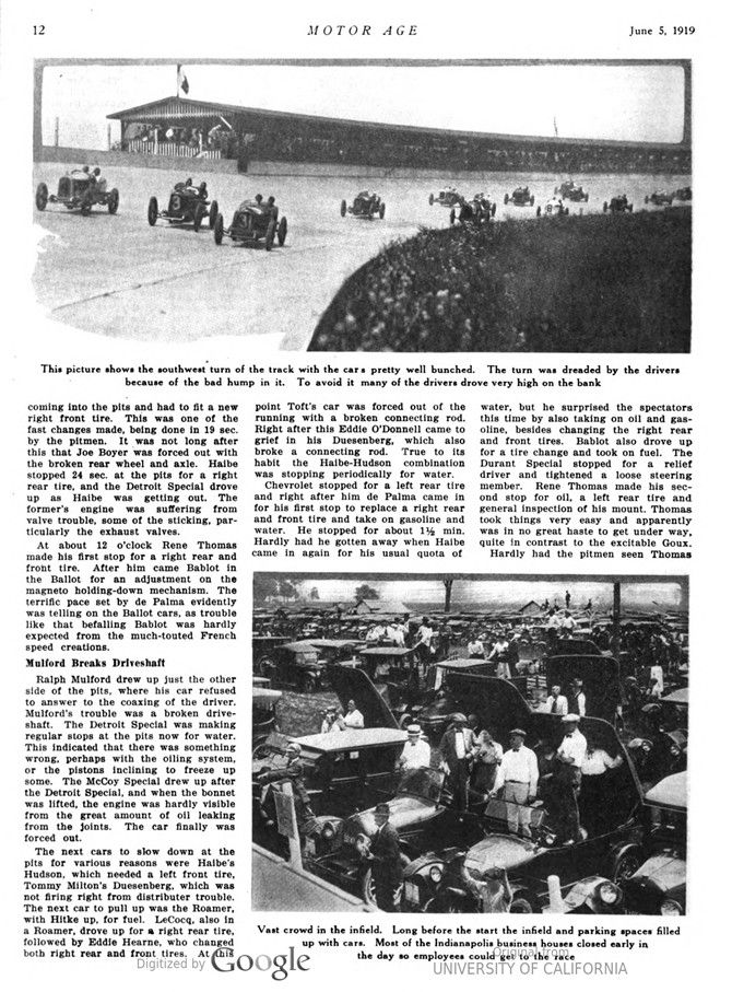 At one time in the race Thomas came in and changed all four tires on his car, filled the gasoline and oil tanks and replaced all the spark plugs. While he was gettting away, de Palma came in for a very long stop, at which time he changed all four tires, replaced a few plugs, took on water and put in a new exhaust valve on No. 1 left cylinder. This was a very costly stop for Ralph and gave Howdy Wilcox a chance to get way in the lead. At this time de Palma remarked that the right front wheel bearing was loose and perhaps broken, but he continued to drive at the same clip as before.