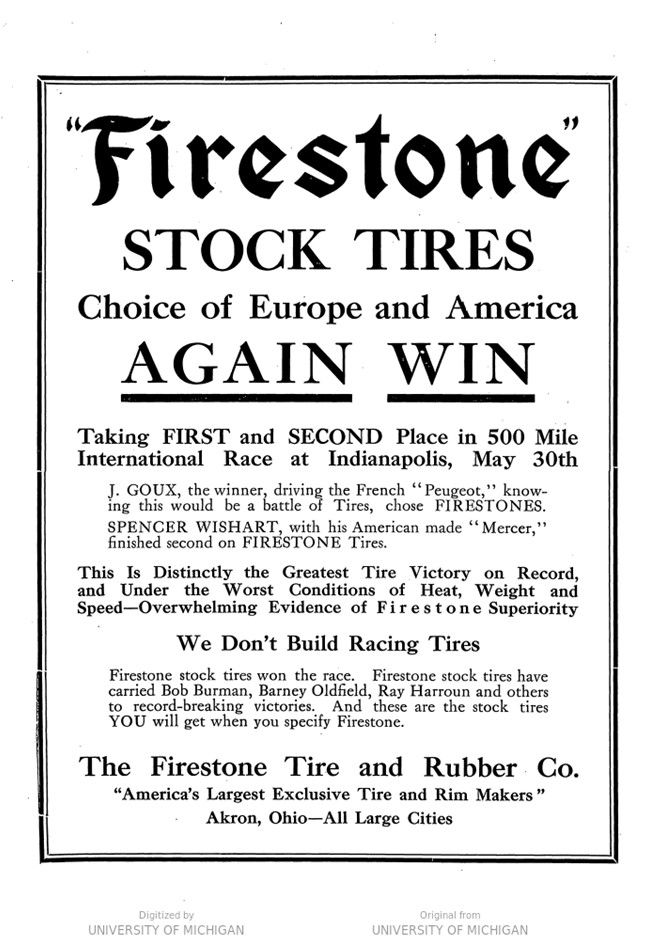 One of the most striking evidences of tire economy which was seen during the day appeared on the Mercedes, driven by Ralph Mulford. This was equipped with Braender tires, made by the Rutherford Tire Co. in New Jersey. Ralph Mulford. had 36×5 in the rear and 36×4 in front. He made the entire distance on the same casings with which he started the race.