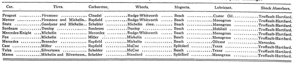 The Peugeot then came in for the second tire, a right rear one, at 10:48, and made the change in one minute and fifteen seconds. At 10:52 „Ed“ Madden relieved Harry Endicott on the Nyberg, and shortly afterward was out of running on account of his transmission gear shaft sticking. It seemed almost as though Goux had scarcely left the pits before he was back again, this time requiring a left rear tire. While the tire was being changed he took on about five gallons of castor oil, the Peugeots using castor oil throughout the race for lubrication.