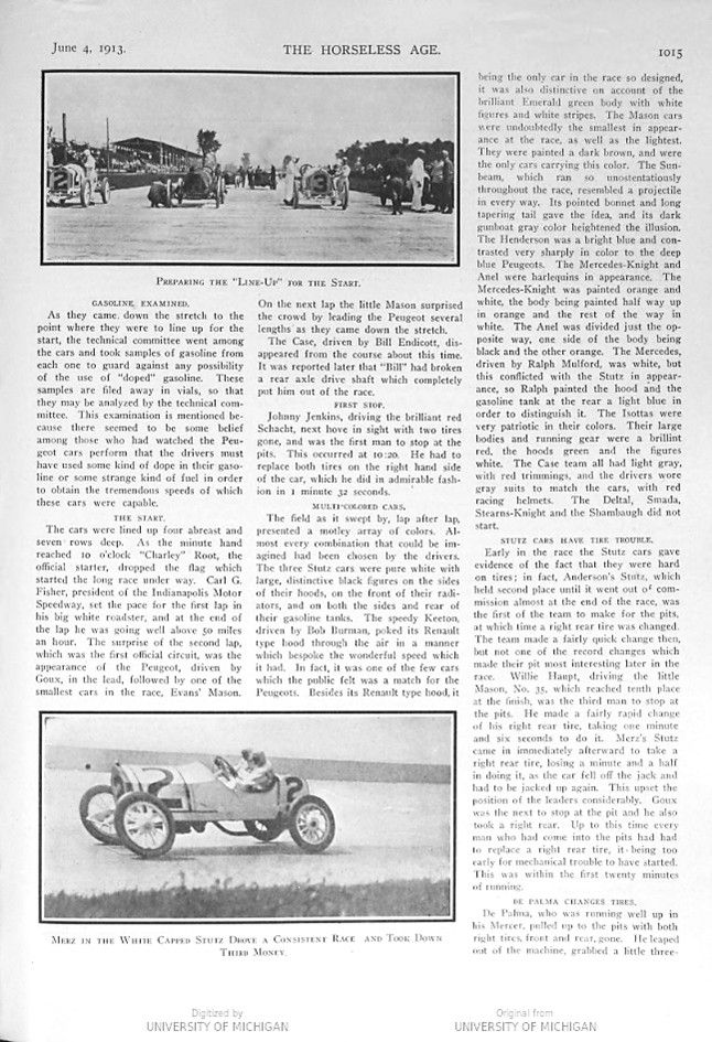 The cars were lined up four abreast and seven rows deep. As the minute hand reached 10 o’clock „Charley“ Root, the official starter, dropped the flag which started the long race underway. Carl G. Fisher, president of the Indianapolis Motor Speedway, set the pace for the first lap in his big white roadster, and at the end of the lap he was going well above 50 miles an hour. The surprise of the second lap, which was the first official circuit, was the appearance of the Peugeot, driven by Goux, in the lead, followed by one of the smallest cars in the race, Evans‘ Mason. On the next lap the little Mason surprised the crowd by leading the Peugeot several lengths as they came down the stretch. The Case, driven by Bill Endicott, dis- appeared from the course about this time. It was reported later that „Bill“ had broken a rear axle drive shaft which completely put him out of the race.