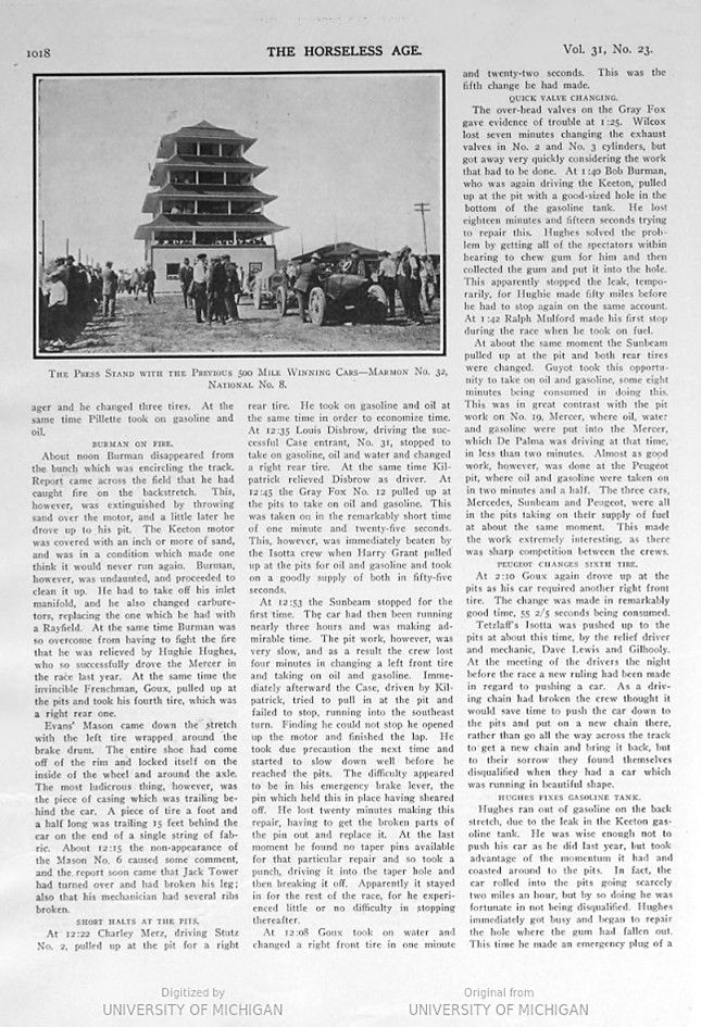 About noon Burman disappeared from the bunch which was encircling the track. Report came across the field that he had caught fire the backstretch. This, however, was extinguished by throwing sand over the motor, and a little later he drove up to his pit. The Keeton motor was covered with an inch or more of sand, and was in a condition which made one think it would never run again. Burman, however, was undaunted, and proceeded to clean it up. He had to take off his inlet manifold, and he also changed carburetors, replacing the one which he had with a Rayfield. At the same time Burman was so overcome from having to fight the fire that he was relieved by Hughie Hughes, who so successfully drove the Mercer in the race last year. At the same time the invincible Frenchman, Goux, pulled up at the pits and took his fourth tire, which was a right rear one.