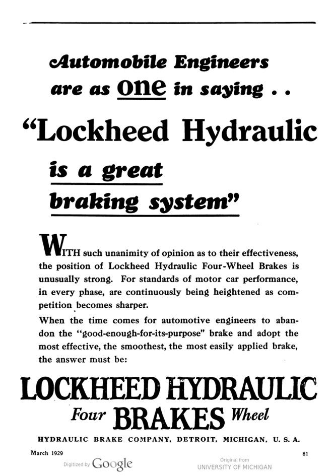 Adequate brakes are specified. The specifications say: „Two independently operated systems of brakes will be required on every car. The secondary system must not be vulnerable to any failure of the primary system. The primary system must operate effectively on all four wheels and be capable of continued use without failure and of arresting the car within reasonable limits. A standard test as to braking effectiveness will be devised by the Indianapolis Race Committee. The secondary system need be effective on but two wheels and must be capable of arresting the car from a hundred-mile-an-hour speed not less than five times in succession without failure. A detailed test for both effectiveness and for repeated operation will be laid down by the Indianapolis Race Committee.