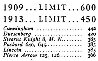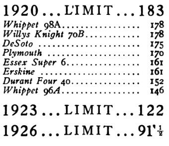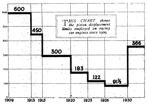 Then dawned a new era. Someone suggested the piston displacement of racing engines be reduced to secure greater power with lessened bulk. Thereupon the limit in this country was set at 600 inches in 1909, reduced to 450 in 1913, to 300 in 1915, to 183 in 1920, to 122 in 1923, to 91½ in 1926.