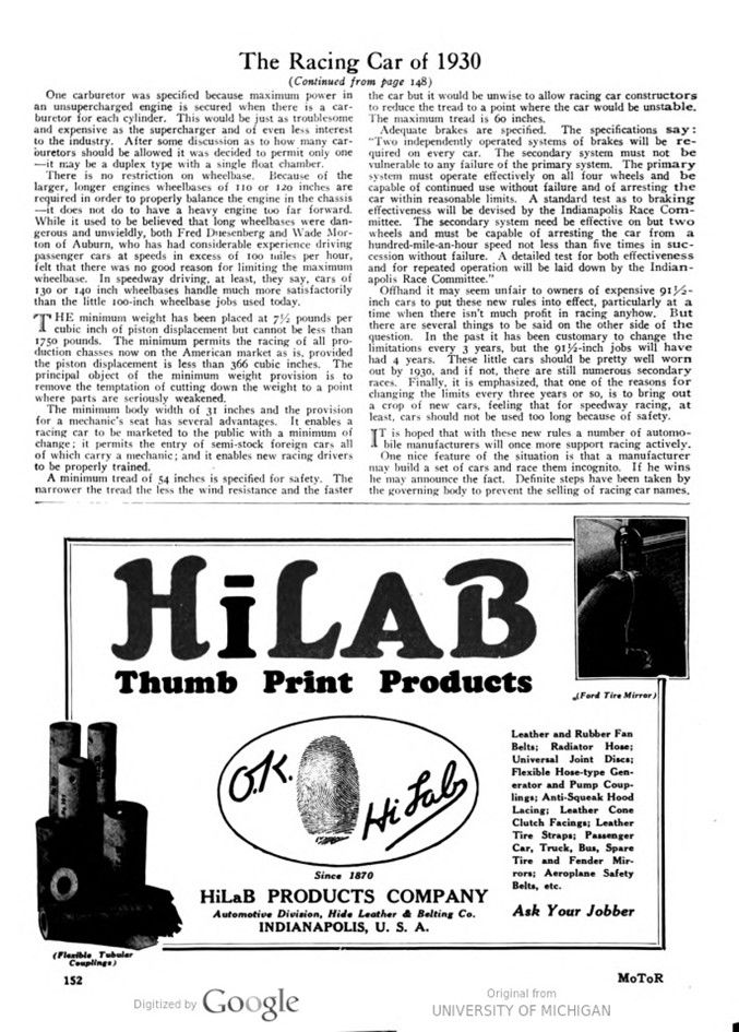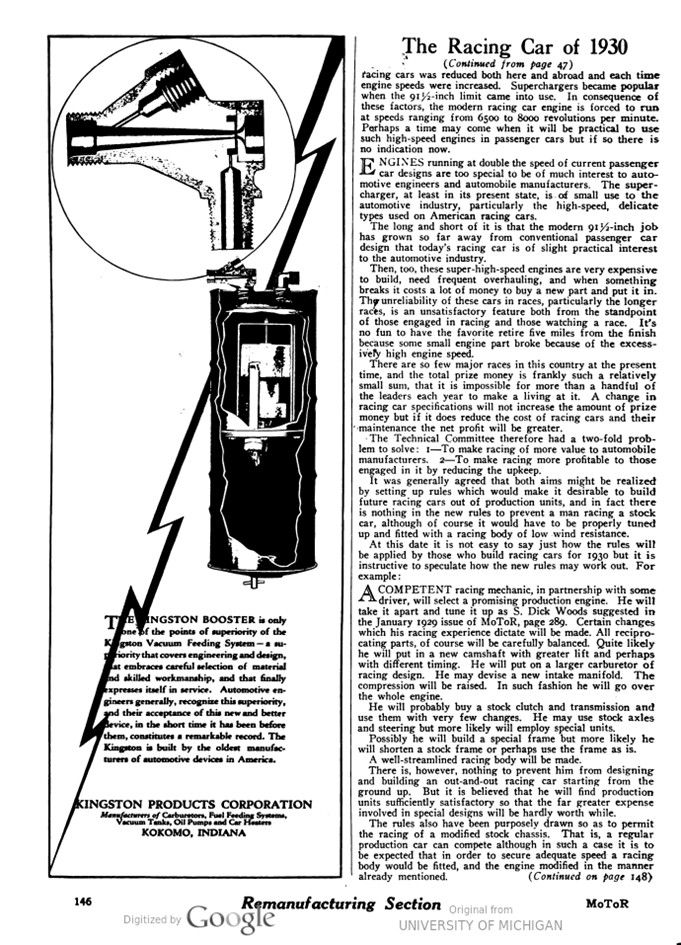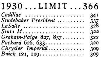 The table at the right shows that racing development has gone too far to be of practical use to the automotive industry, a fault corrected by making the piston displacement for 1930 that of a large modern automobile, namely 366 cubic inches.