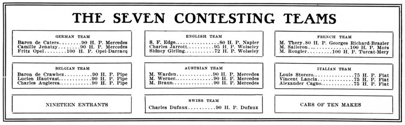 The nineteen entrants represent ten makes of cars, all except the Dufaux recognized as dangerous competitors in any kind of race and all except this and the English Wolseleys winners in previous big road events. The three the Pipe cars representing Belgium and three Fiats from Italy are next in degree of newness, but they have shown themselves in minor events to be in the class.