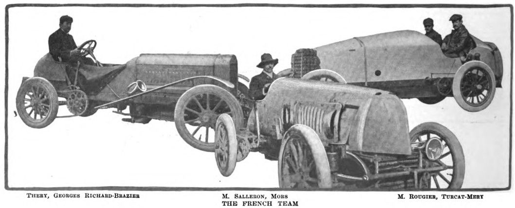 The three French cars were picked from twenty-nine entrants by a trial race over the French Ardennes Circuit, in which only ten finished, many favorites being out of the running. The Georges Richard-Brasier, Mors and Turcat-Mery, chosen to represent France, finished this race respectively first, second and third.