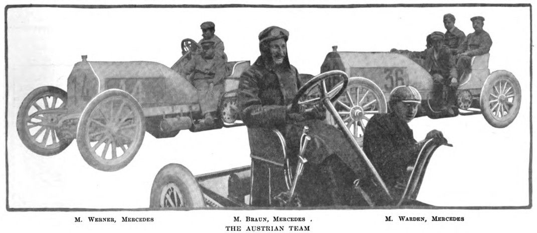 The three Mercedes which compose the Austrian team are substantially like the German Mercedes, being the product of the Austrian Mercedes company, which builds Mercedes cars from the designs of the parent company. Werner, Braun and Warden have been driving German Mercedes cars for several years and are especially known on account of their performances at the annual Nice week meeting and for having figured well in the Semmering and Exelberg hill climb contests which are annually run in Austria, and in the Paris-Madrid race.