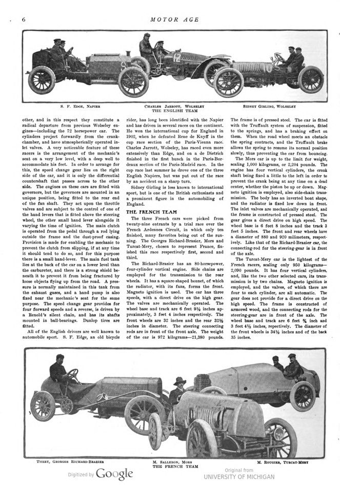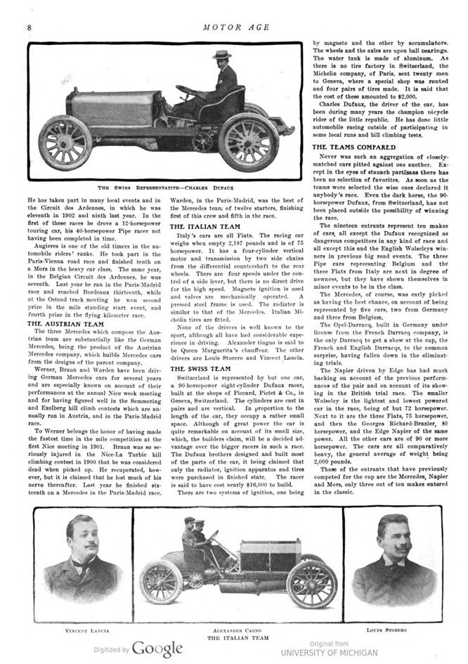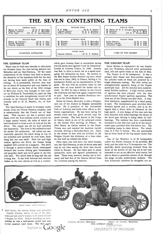 In this issue of „Motor Age“ of their series on the 1904 Gordon Bennet Cup, the contesting teams are described. The German, French, English, Austrian, Belgian ,Italian teams, as well as the sole Swiss representative. The last one, alas, wouldn’t participate, leaving „only“ 18 teams for the 1904 edition of the Gordon Bennet Cup Race.