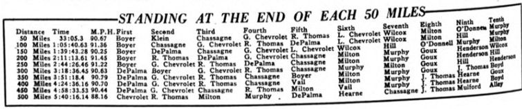 CHEVROLET – RENE THOMAS – MILTON – MURPHY DE PALMA – HEARNE CHASSANE — JOE THOMAS – MULFORD – RAY HOWARD – SCALES – ELLINGBOE – STEIN – ELLIOTT – PORPORATO – VAIL – A. CHEVROLET – O’DONNELL – HAUPT – SARLES – BOILLOT – BOYER – DURANT- L. CHEVROLET – ROONEY – GOUX – WILCOX – HITKE