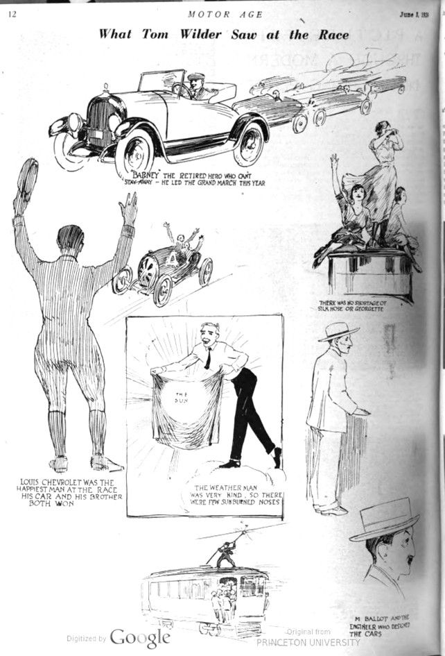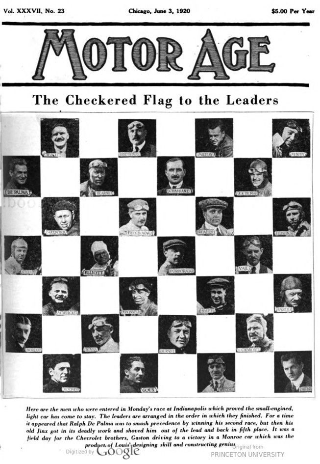 Here are the men who were entered in Monday’s race at Indianapolis which proved the small-engined, light car has come to stay. The leaders are arranged in the order in which they finished. For a time, it appeared that Ralph De Palma was to smash precedence by winning his second race, but then his old Jinx got in its deadly work and shoved him out of the lead and back in fifth place. It was a field day for the Chevrolet brothers, Gaston driving to a victory in a Monroe car which was the product of Louis‘ designing skill and constructing genius