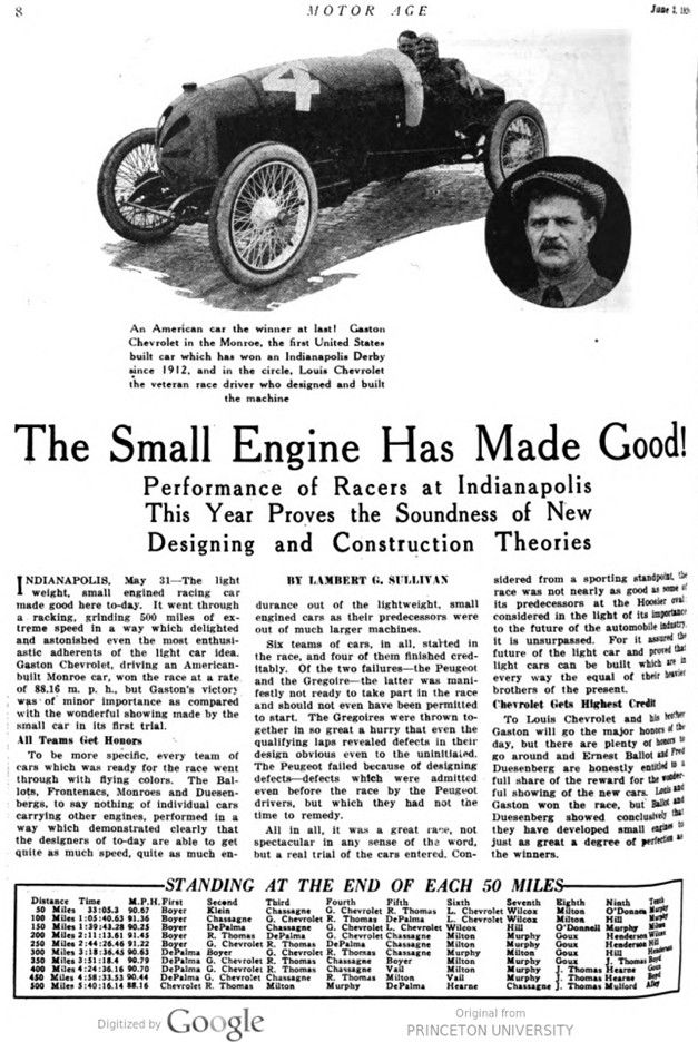INDIANAPOLIS, May 31 – The light weight, small engined racing car made good here to-day, It went through a racking, grinding 500 miles of extreme speed in a way which delighted and astonished even the most enthusiastic adherents of the light car idea. Gaston Chevrolet, driving an American-built Monroe car, won the race at a rate of 88.16 m. p. h., but Gaston’s victory was of minor importance as compared with the wonderful showing made by the small car in its first trial.