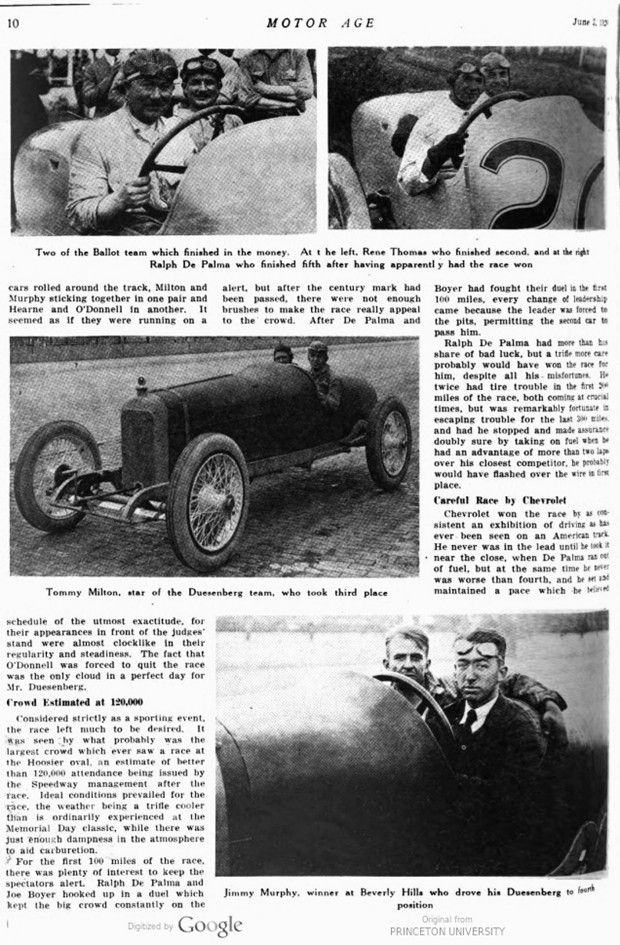 Fred Duesenberg also had a memorable achievement. Four Duesenbergs were at the line for the start of the race and three of them finished within the money. It seemed as if the Duesies were not quite as fast as the Ballots and the Chevrolet creations, but their performance impressed those who saw the race that they were extremely reliably constructed and that they were capable of standing a great deal of work.