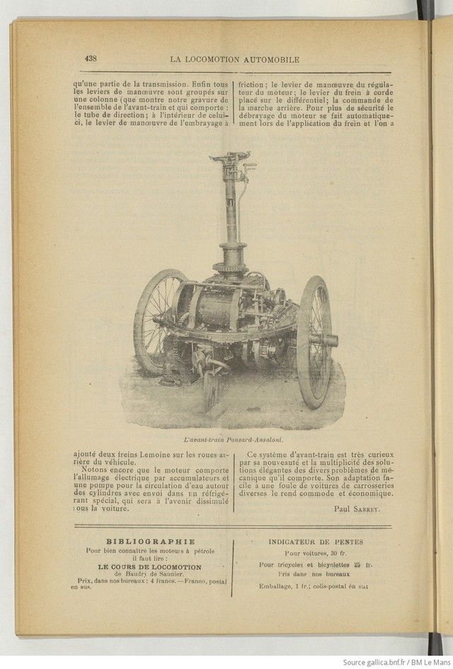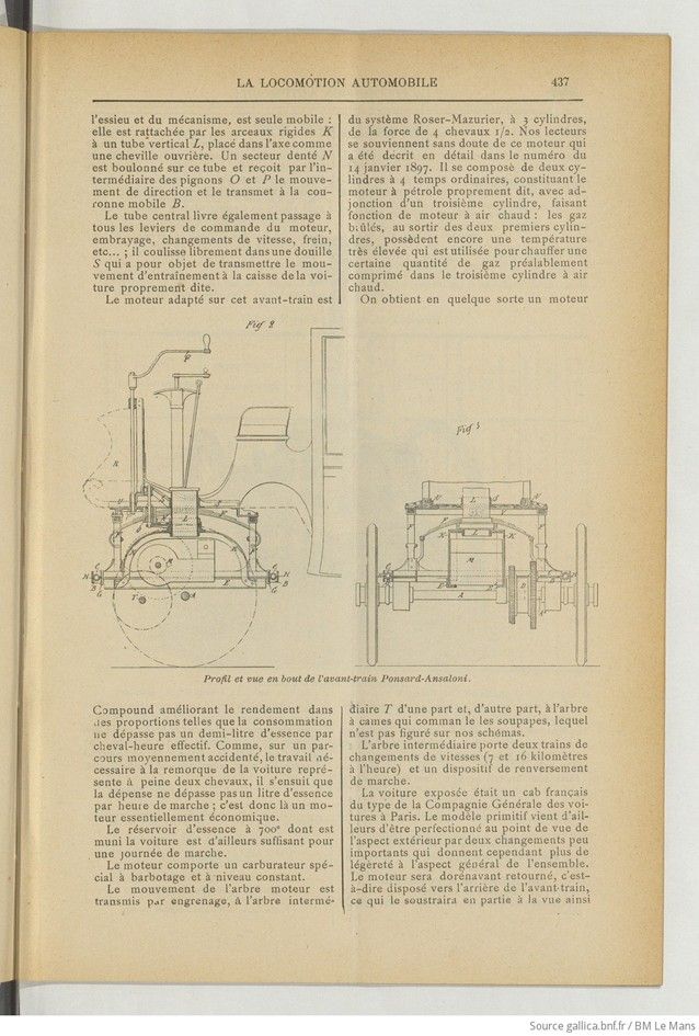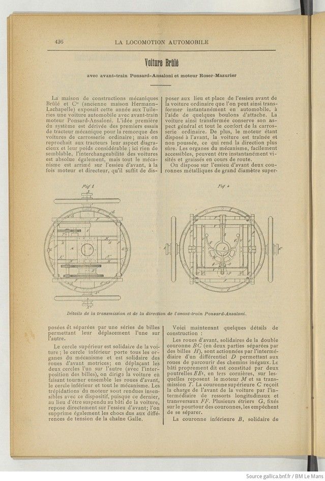 The mechanical engineering company Brûlé et Cie (formerly Hermann-Lachapelle) exhibited a car with a Ponsard-Ansaloni front end and engine at the Tuileries this year. The original idea for the system was derived from the first attempts at mechanical tractors for towing ordinary carriages, but the tractors were criticized for their unsightly appearance and considerable weight. Here, there is nothing of the sort. The cars are also completely interchangeable, but the entire mechanism is attached to the front axle, which is both the engine and the steering mechanism. It can be easily installed in place of the front axle of a standard car, which can thus be instantly converted into an automobile with the help of a few bolts. The car thus transformed retains its general appearance and all the comfort of the ordinary bodywork. In addition, as the engine is located at the front, the car is pulled rather than pushed, which makes steering safer. The mechanism’s components are easily accessible and can be inspected and lubricated instantly while on the road.