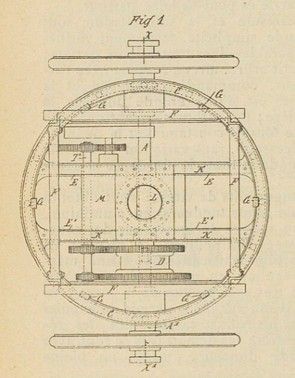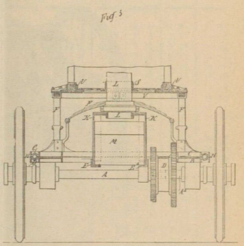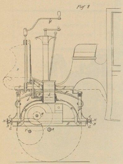 The lower ring B, which is integral with the axle and the mechanism, is the only one that moves: it is attached by rigid hoops K to a vertical tube Z, placed in Taxe like a kingpin. A toothed sector N is bolted to this tube and receives the steering movement via the pinions O and P and transmits it to the mobile ring B.