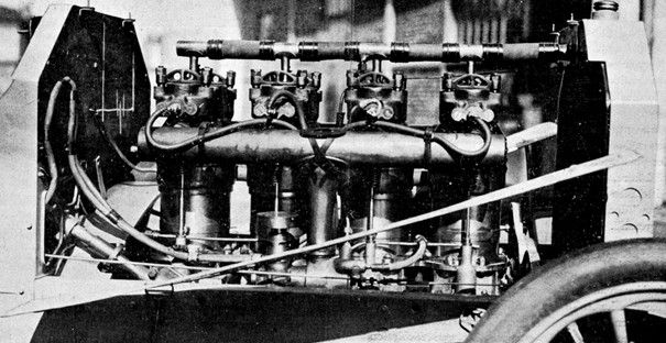Le moteur est à 4 cylindres séparés, en acier, de 170 de course et 170 d’alésage, d’une force effective de 120 chevaux. La circulation d’eau est assurée autour des cylindres au moyen de chemises en cuivre, soudées à l’argent et non plus à l’étain; le radiateur à tubes de l’an dernier est remplacé par un nid d’abeilles à tubes carrés du modèle connu.