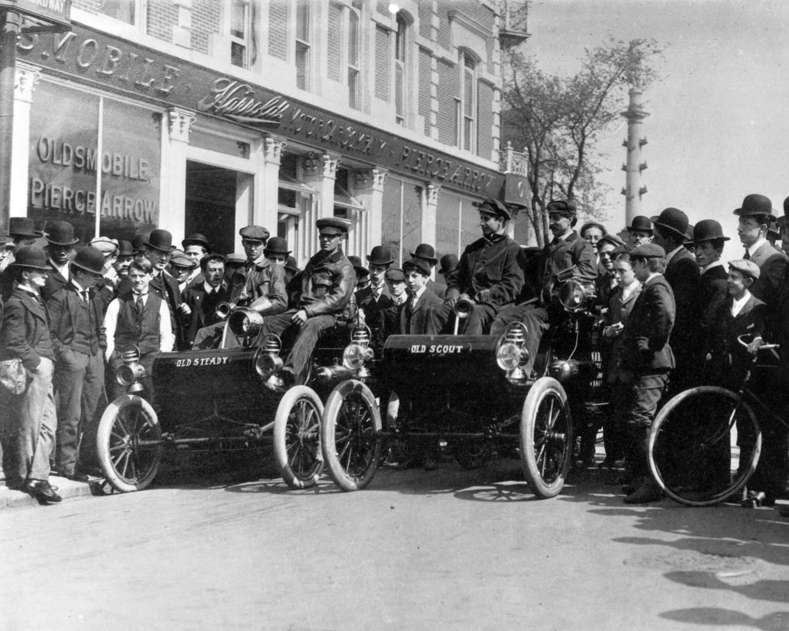 1 The start of a race between steam buggies at Newport, R. I., in 1902