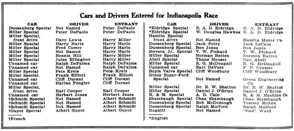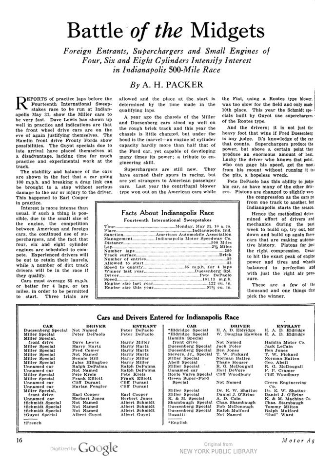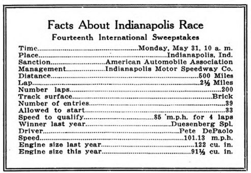 Interest is more intense than usual, if such a thing is possible, due to the small size of the engine, the competition between American and foreign cars, the continued use of superchargers, and the fact that four-, six- and eight-cylinder engines are scheduled to compete. Experienced drivers will be out to retain their laurels, while a number of dirt track drivers will be in the race if they qualify.